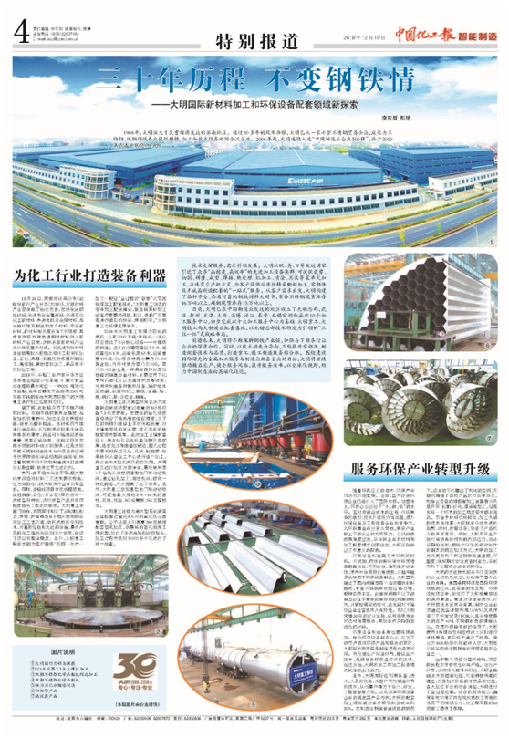 12月19日,《中国化工报》第4版整版刊发报道,对大明国际在新材料加工和环保设备配套领域进行的新探索进行了详细解读,详见: