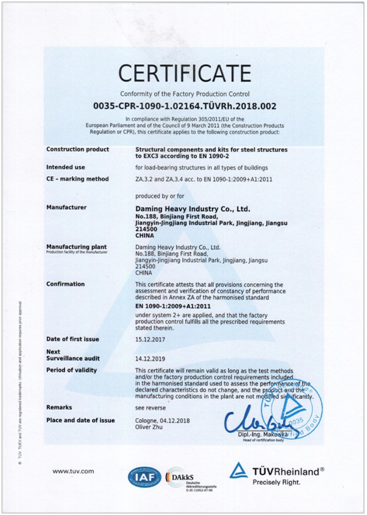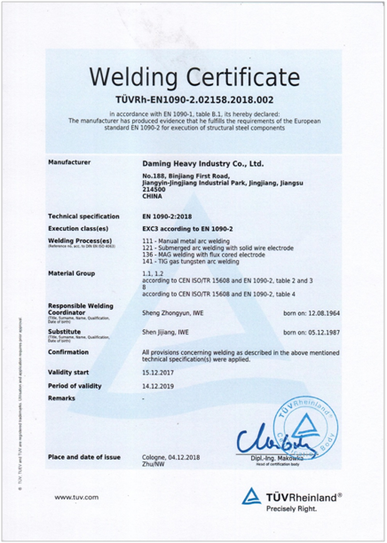 2018年9月TÜV派出专家组对大明重工EN1090-1:2009+A1:2011;EN1090-2:2018进行了换证审核,对AD 2000-Regelwerk/DIN EN ISO3834-2进行了监督审核。TÜV专家组对我公司产品、设备、人员等给与了很高的评价,对公司质保体系建立和运行的实际情况等方面进行了认真、详细的审核,对不足之处也给出了专业的指导意见。通过不断改进、改善,2018年12月15日,大明重工顺利取得了TÜV Rheinland颁发的新证书。
