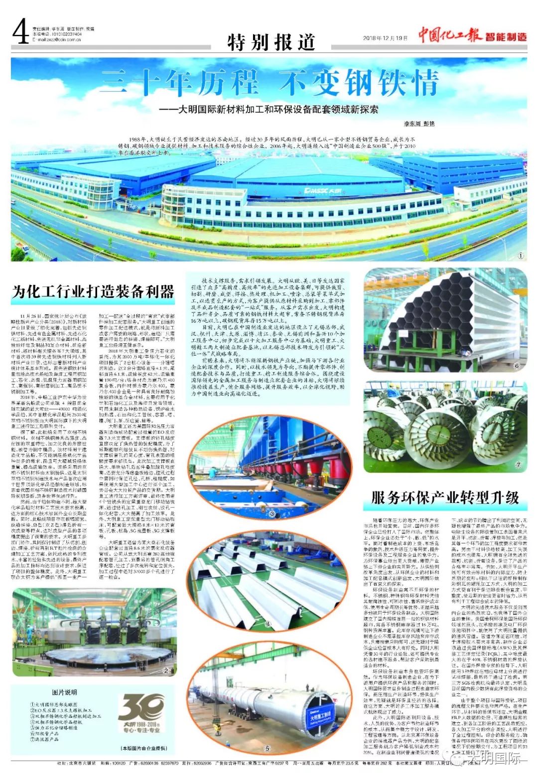 12月19日,《中国化工报》第4版整版刊发报道,对大明国际在新材料加工和环保设备配套领域进行的新探索进行了详细解读,详见: