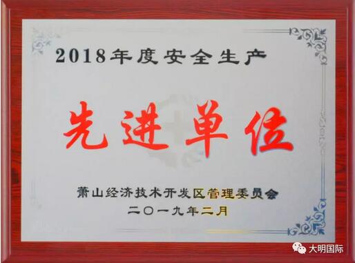 近日,杭州萧山经济开发区管委会授予大明杭州加工中心“2018年度安全生产先进单位”称号。