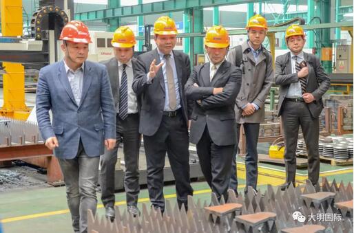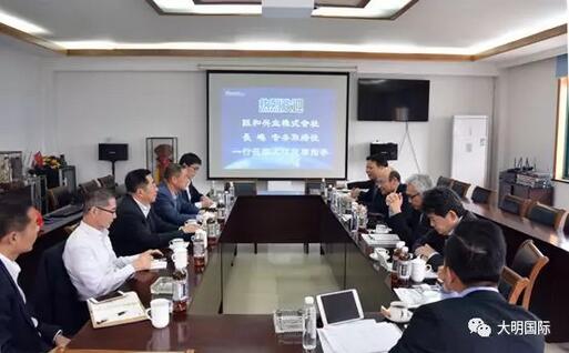 4月16日,阪和兴业株式会社長嶋专务取缔役、厚板部中村部长、机械部河内课长等一行来访大明,大明国际董事会主席周克明、总裁蒋长虹、集团市场开发部总经理福井勤、大明重工副总经理罗智辉、集团装备部部长刘学政等热情接待。