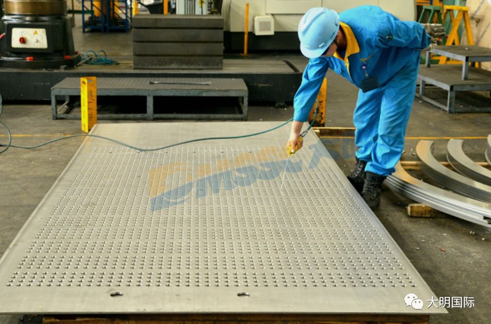 此前,该环保设备客户经过对江苏大明多次考察,非常认可大明的加工设备、配套设计能力及管理体系,于是达成合作。首批订单产品选用8mm厚304不锈钢,江苏大明设计部门经过研讨论证,将客户此前的规格3520mm×3680mm拆分为两块1800mm×3680mm的钢板,加工完毕客户再进行拼装与焊接。