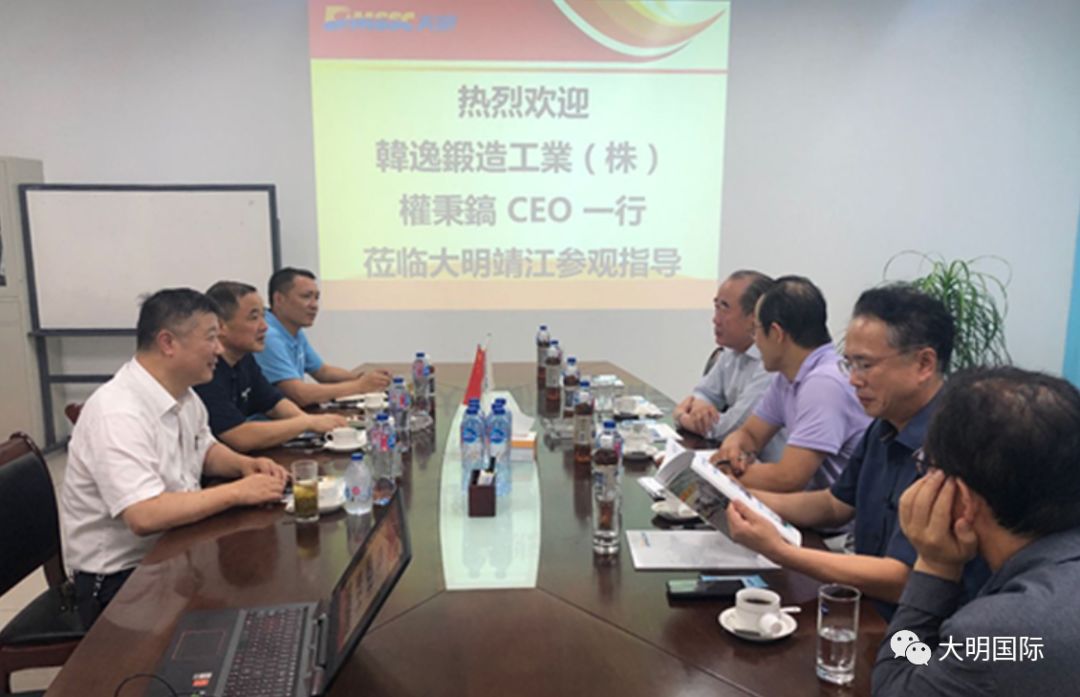 2019年7月20日,作为世界上最大的三个主轴制造商之一的Hanil锻造公司,韩逸锻造工业(株)CEO权秉镐来访大明靖江基地,大明国际董事会主席周克明、大明重工总经理王健、集团采购总监倪晨热情接待。