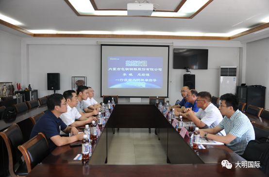 8月17日,内蒙古包钢钢联股份有限公司总经理李晓、销售公司副经理宋云龙、销售公司部长刘旭、华东分公司总经理刘宇阳一行来访大明。大明国际总裁蒋长虹、集团碳钢事业部总经理陈宁、靖江加工中心总经理王小建、碳钢事业部采购总监邓梁峰、总经理助理周伟、靖江加工中心总经理助理程汉等热情接待。