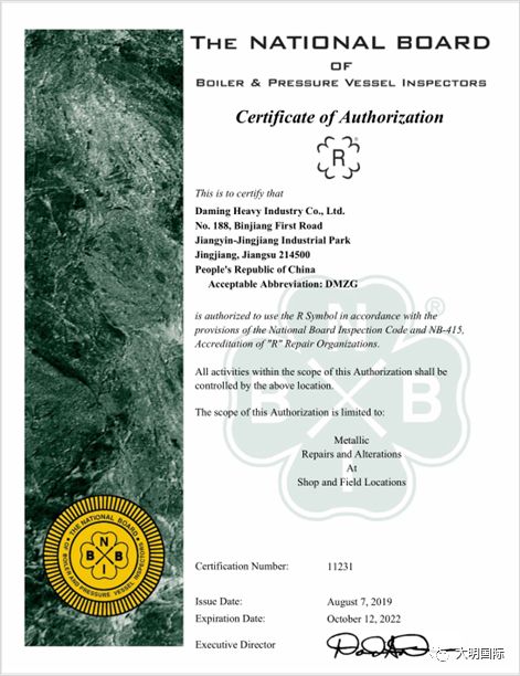 ASME锅炉和压力容器认证证书和钢印是当前国际锅炉和压力容器最具权威的认证证书,是锅炉压力容器装备制造企业进入国际市场的通行证。按照规定,美国ASME总部每三年对持有ASME证书的厂家进行换证联检,未通过换证联检的将被取消ASME产品设计、制造资格。大明重工作为ASME授权的锅炉压力容器制造企业,自取证以来,为国内外用户提供了大批质量可靠、性能稳定的ASME规范产品,再次通过审核,表明大明重工提供高品质压力容器配套服务的能力得到了巩固和加强。