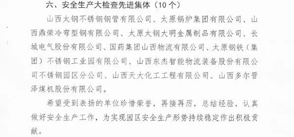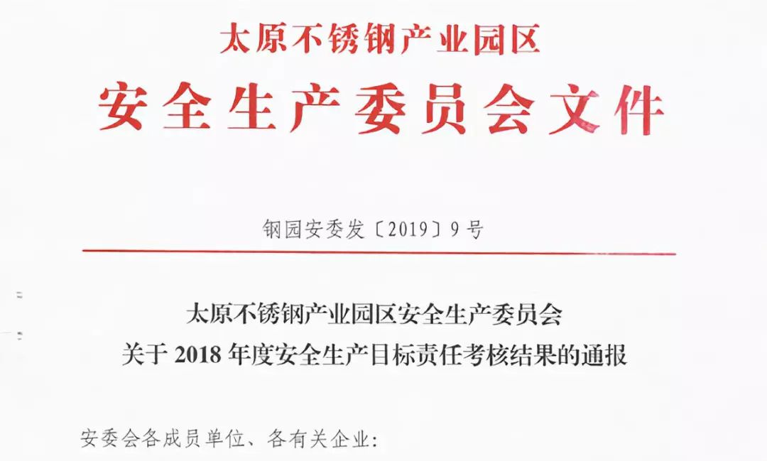 近日,太原市不锈钢产业园区召开2018年度安全生产工作总结大会,太原加工中心连续第二年被授予“年度安全生产大检查先进单位”荣誉称号。