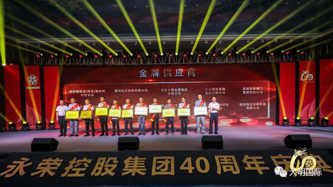 9月8日,“新永荣 新征程”永荣控股集团40周年庆典在福州盛大举行。江苏大明总经理张锋、扁钢销售部部长袁康等受邀前往,共同见证永荣人踏上新征程的辉煌时刻。仪式上,江苏大明被授予“金牌供应商”荣誉。