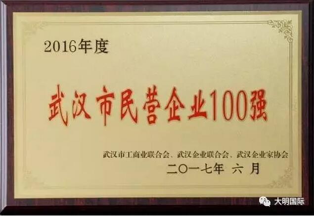 6月13日,武汉市工商业联合会、武汉企业联合会、武汉企业家协会联合发布“2016年度武汉民营企业100强、民营制造业企业50强榜单”,湖北大明金属科技有限公司入选“2016年度武汉民营企业100强”并荣列第66位,位列“民营制造业企业50强”第25位。