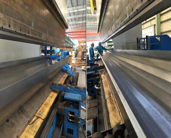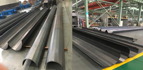 此批产品材质为Q345B,长度为9m-12m,厚度为10-16mm。产品先后经过开平、激光切割、折弯成型等工艺,加工过程充分利用了杭州万洲2000T折弯机等先进设备的优势,保质按时完成了订单。订单顺利交付后,客户对于产品的切割、折弯精度非常满意,表示后期会将批量订单交由杭州万洲加工。