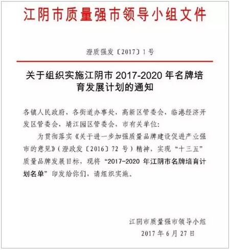 6月27日,江阴市质量强市领导小组于发布了【2017】1号文件,通知组织实施江阴市2017-2020年名牌培育发展计划,大明重工等100多家企业被列入“2017-2020年江阴市品牌培育计划”名单,江阴-靖江工业园区仅有两家企业入选。