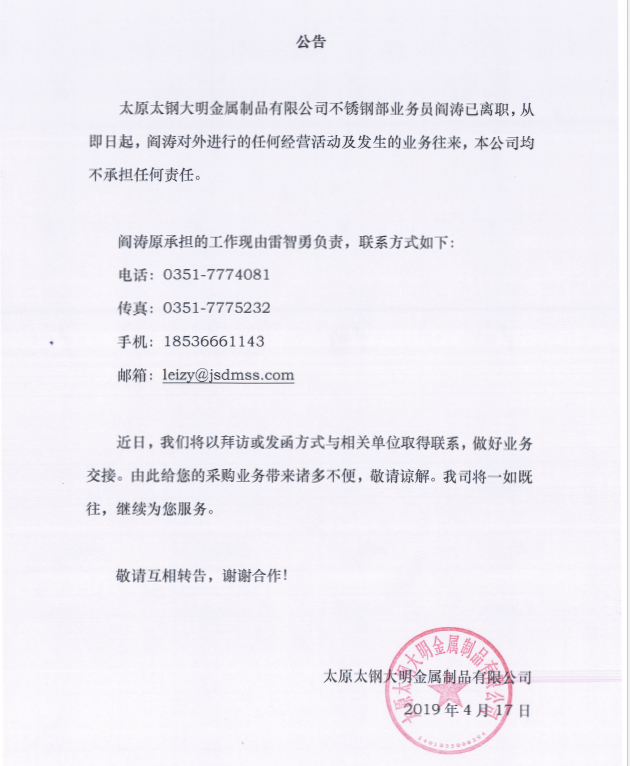 关于阎涛离职公告