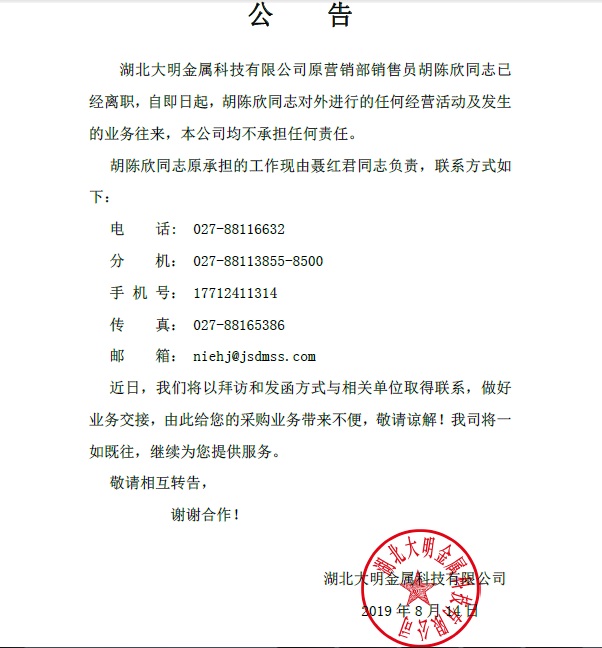 湖北大明胡陈欣离职公告