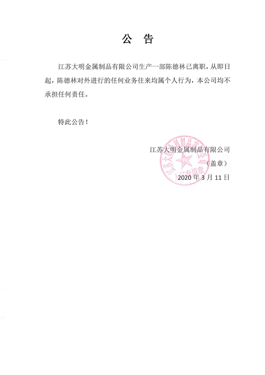 关于陈德林离职公告