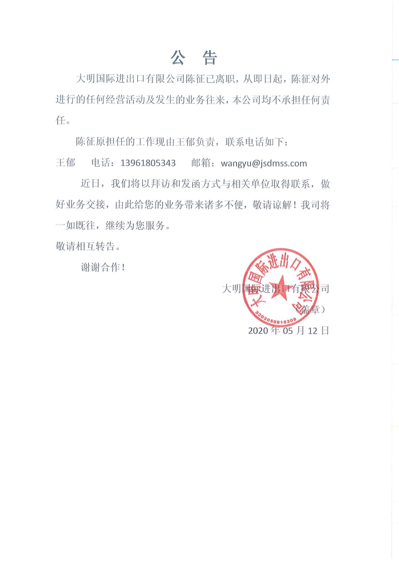 关于陈征离职的公告