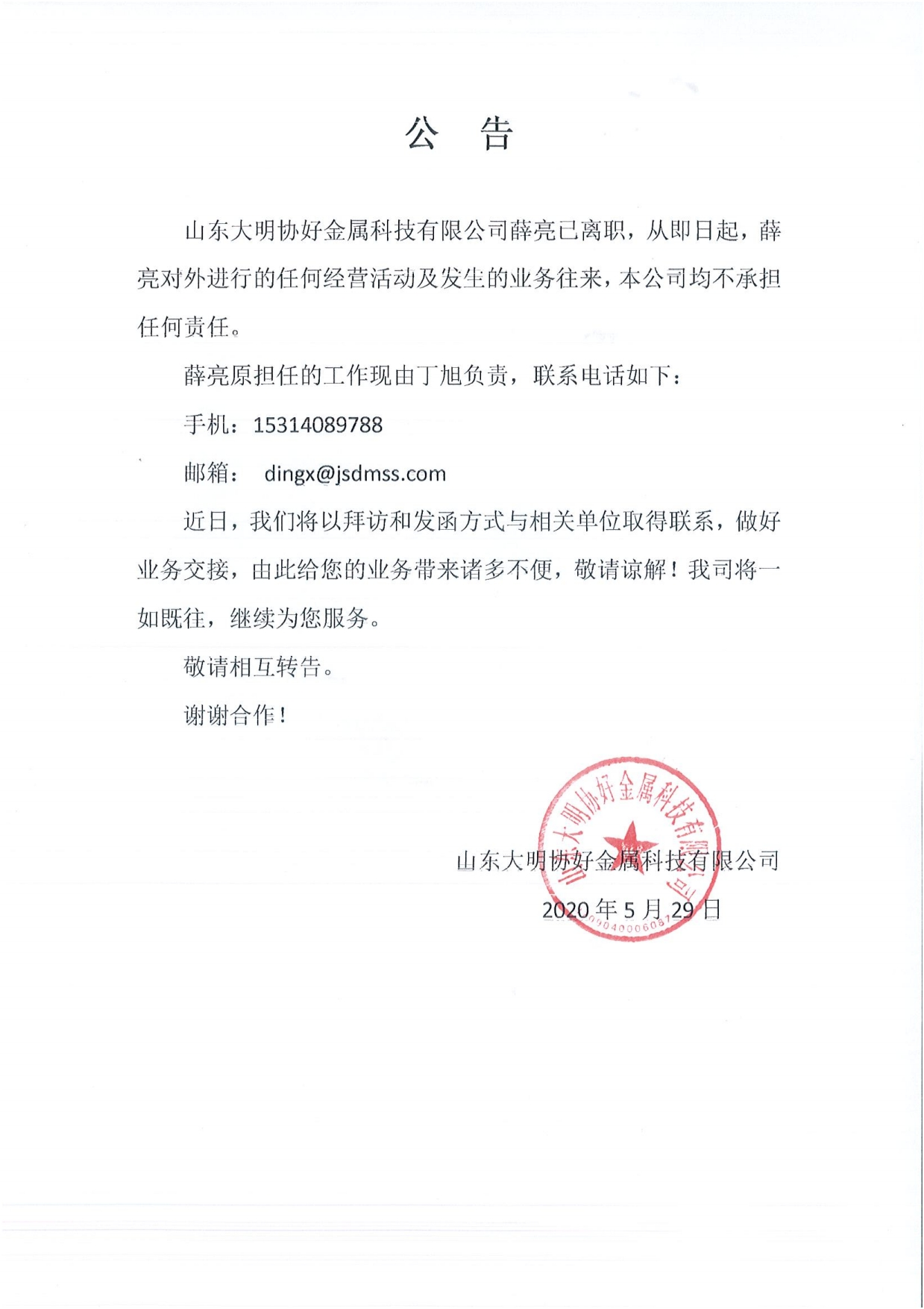 关于薛亮的离职公告
