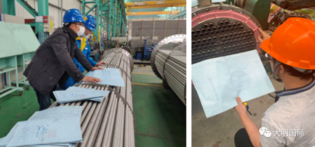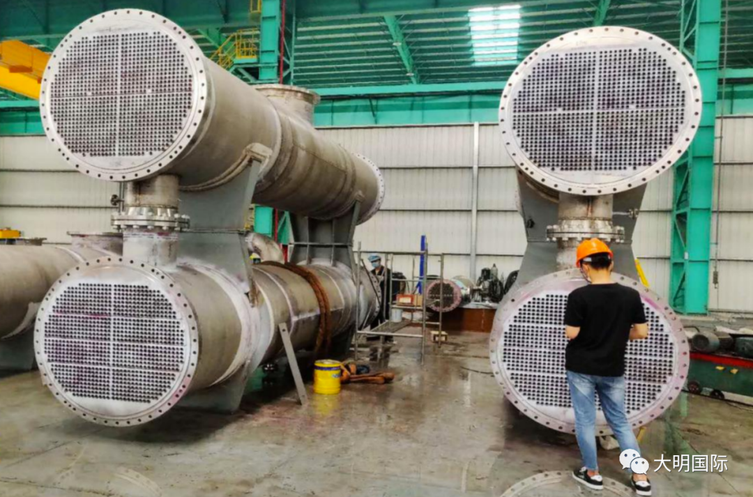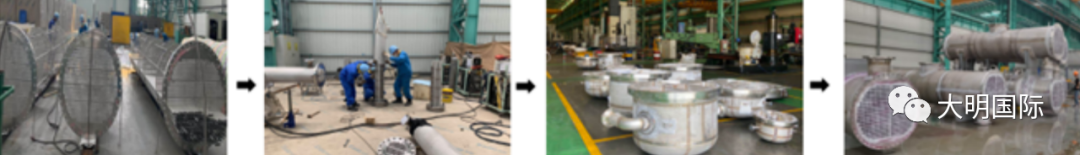 为保证项目质量和进度,大明重工组织内部技术、生产、质量、采购等部门每日召开项目会议,督促采购进度,梳理当日制作难点。生产部门合理调配人力四班三轮昼夜全力推进项目进度。面对这种“双胞胎”式的换热器,工艺非常复杂,从下料、切割、圈圆、机加、焊接、热处理、酸洗等多道工序,隔板分层较多,质量要求极高,时间也很紧迫。监理的严格检查,大明人精益求精,不断挑战,解决难题,加工紧张顺利,受到了客户的充分肯定。