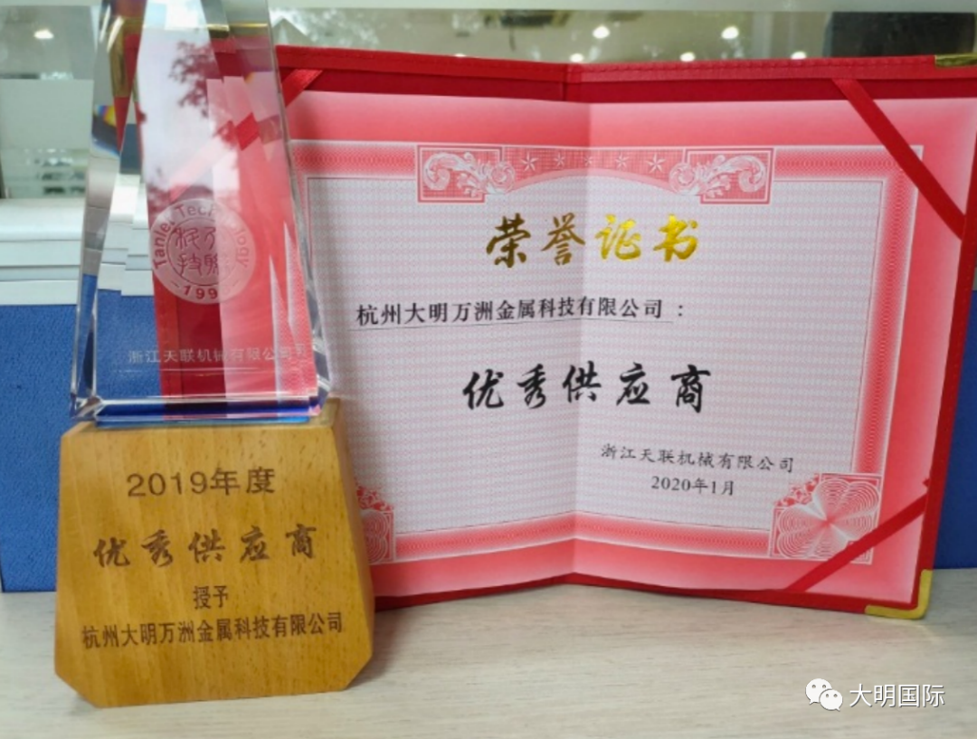 1、大明杭州加工中心被多家客户授予“年度优秀供应商”称号