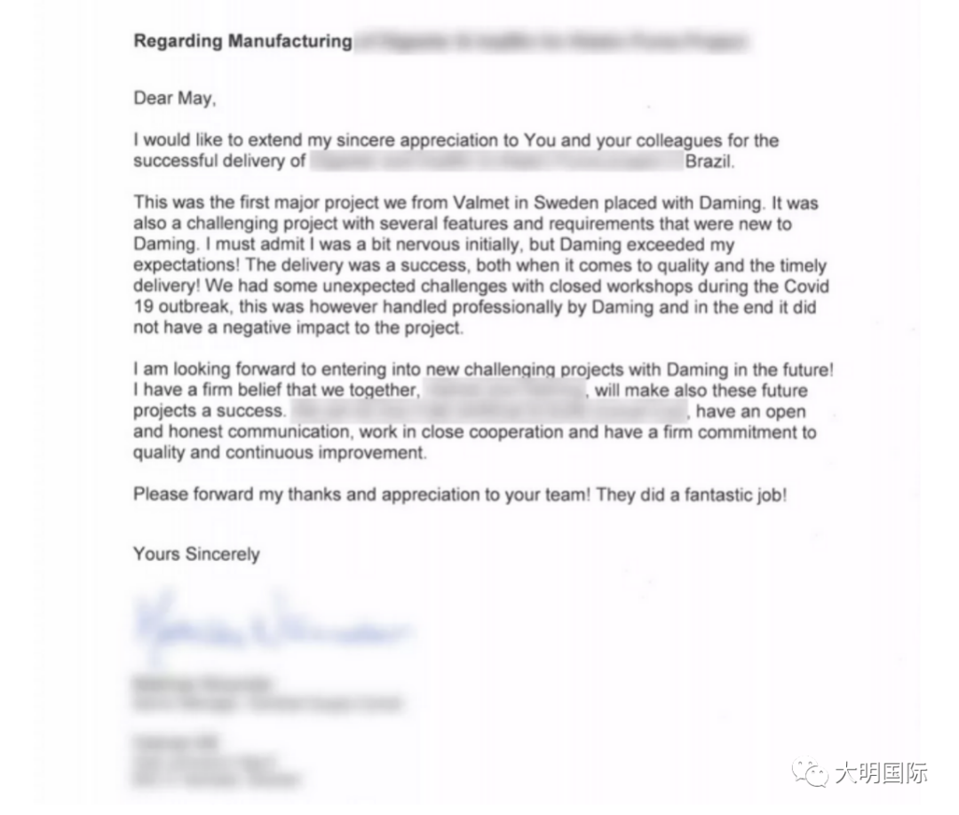 4月份,大明重工再次收到来自欧洲某知名制浆造纸设备企业的感谢信,对于双方合作项目的质量和交期表示满意和诚挚的谢意,对于大明团队认真敬业的工作态度,高效高质的工作成果表示了高度的肯定。