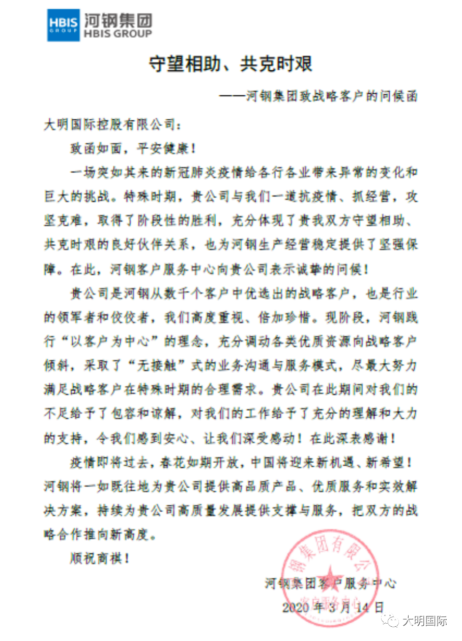 3、守望相助、共克时艰,河钢集团致函大明国际表示感谢
