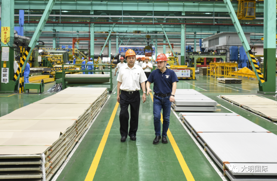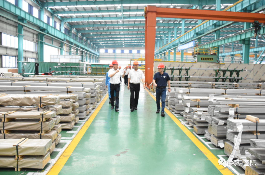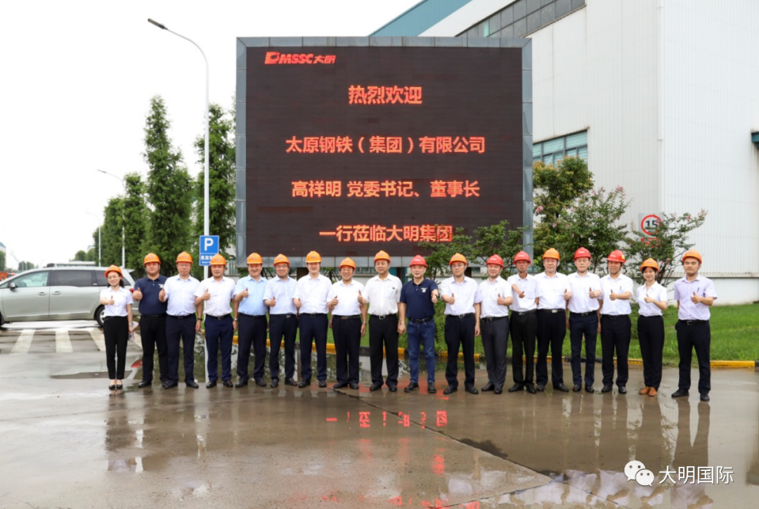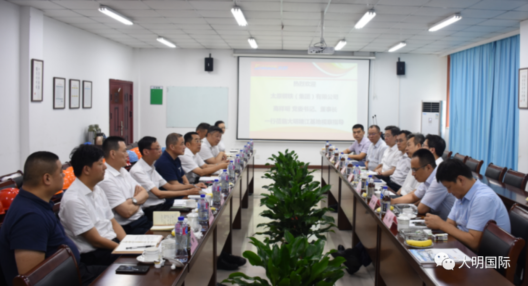 7月17日,太原钢铁(集团)有限公司党委书记、董事长高祥明、太钢不锈钢股份有限公司总经理李华、太钢不锈营销总监尚佳君、太钢集团规划发展部部长张国庆、太钢不锈技术中心主任南海、太钢不锈冷轧厂厂长徐书峰、太钢不锈营销中心销售运营部总经理解浩、无锡太钢销售公司经理段亚楠一行来访大明,大明国际董事会主席周克明、总裁蒋长虹、大明重工总经理王健、江苏大明总经理张锋、大明精工总经理张必宏、集团不锈钢事业部总经理倪晨、集团生产技术总监王小建、大明进出口总经理陈莉慧、大明特材总经理卞薇薇、集团采购总监助理黄潜等热情接待。