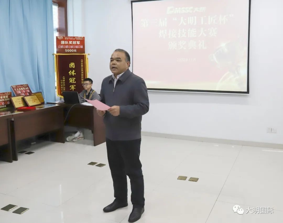 大明精工总经理助理陈建民为个人新秀奖(焊条电弧焊/氩弧焊/CO2气保焊)选手颁奖