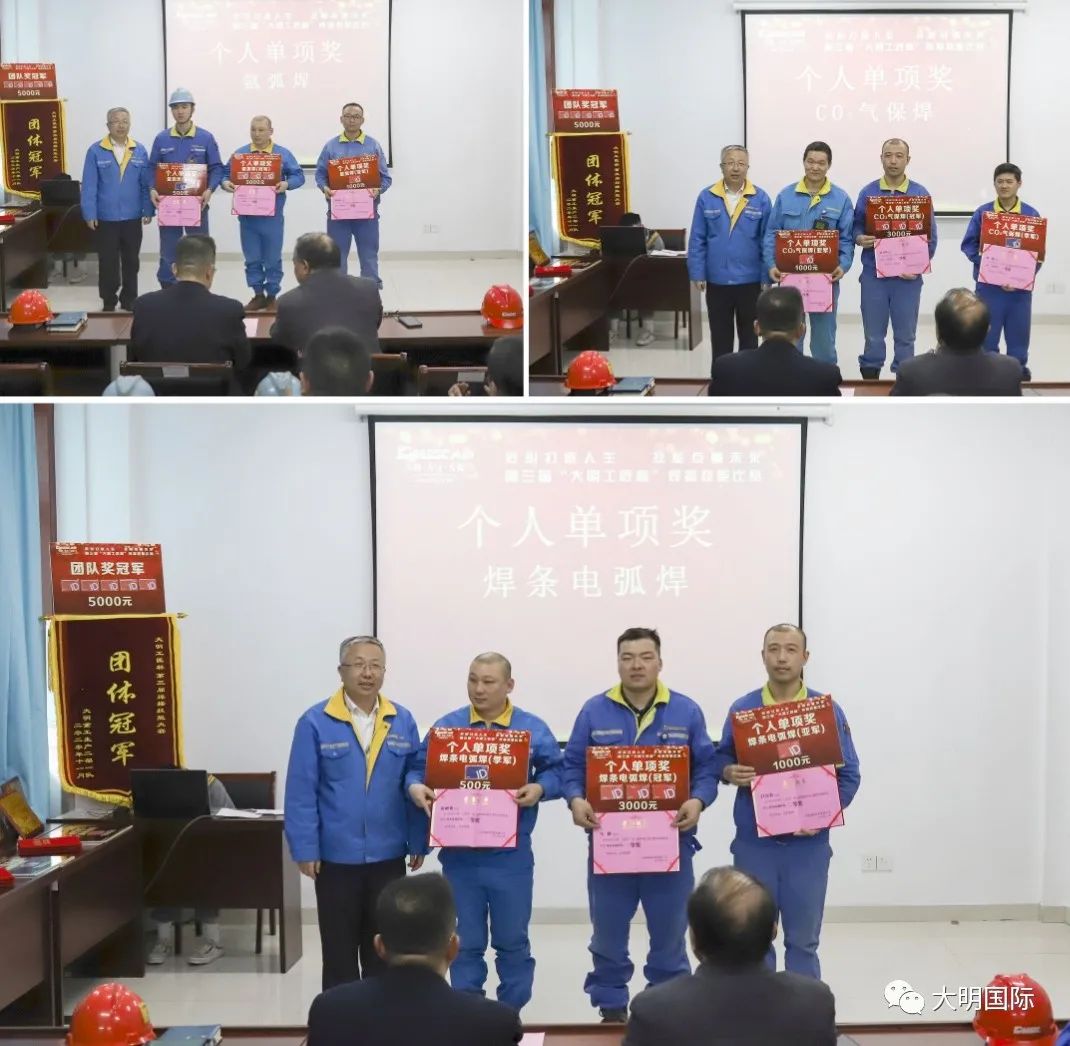 大明重工总工程师王毅民为个人单项奖(焊条电弧焊/氩弧焊/CO2气保焊)前三名选手颁奖