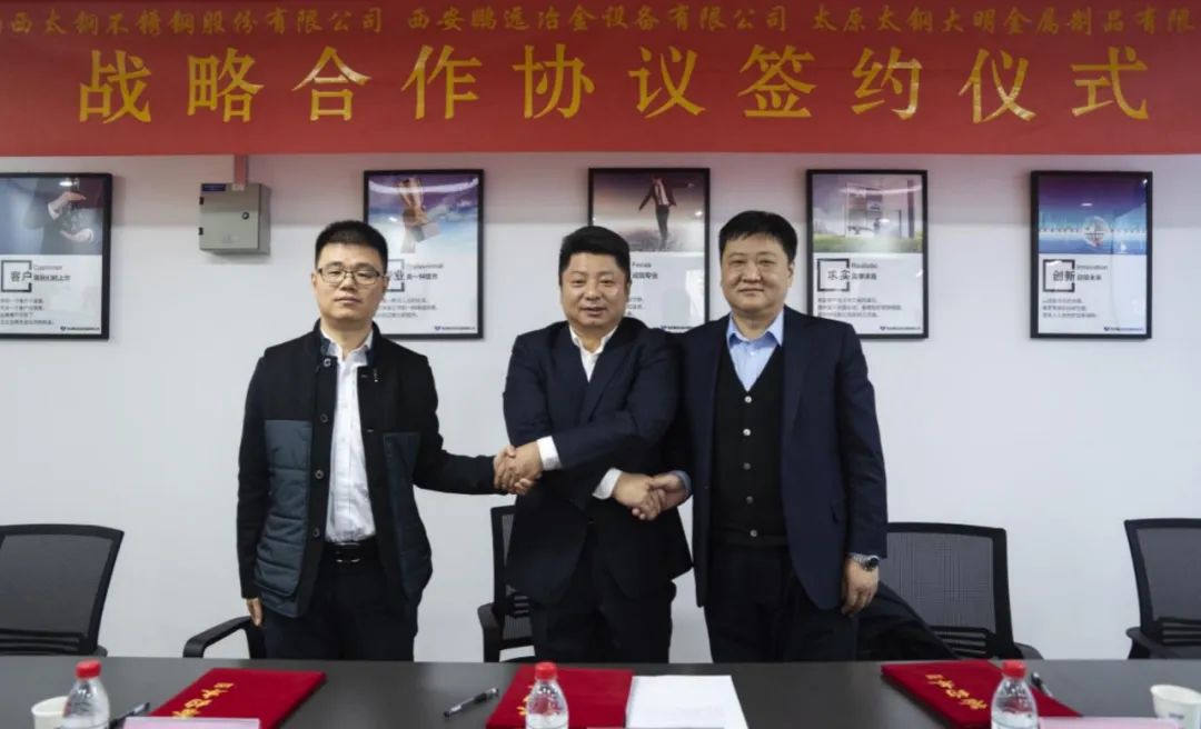 为进一步强化钢铁产业链企业合作,携手上下游共同创新发展。近日,大明太原加工中心与山西太钢不锈钢股份有限公司、西安鹏远冶金设备有限公司签署三方合作协议。太钢不锈销售运营部总经理解浩、大明太原加工中心总经理钱立、西安鹏远总经理刘煊亮分别代表三方签约。