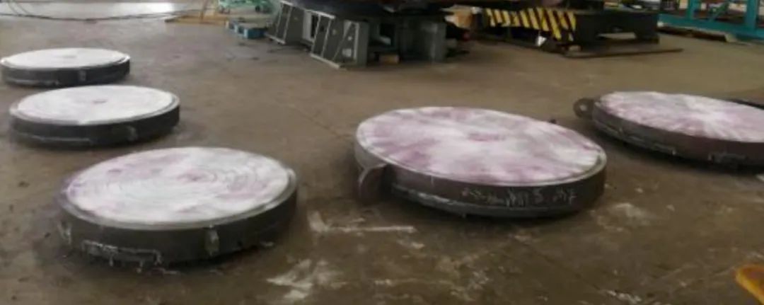 2020年10~11月份,生产二部堆焊班组承制了河南、浙江客户不同尺寸、厚度的管板合计24件。其中堆焊材质09MoL+316L,最大直径2300mm,堆焊厚度9mm。生产二部成立管板攻关小组进行工艺优化,管板变形得到有效控制,于12月10日完成堆焊。整个过程生产效率得到很大提高,为开拓相关领域市场打下坚实的基础。